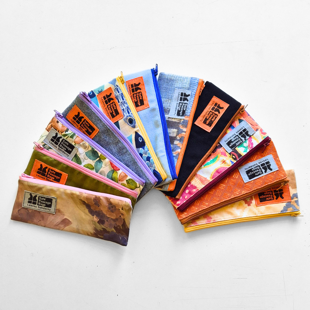 The small pencil case is colorful and perfect for carrying stationary, art supplies, or small makeup products. It is handmade in our workshop on Lesvos using recycled tents from the camp. With this bag, you preserve the journey of those who crossed the sea in search of safety and join us in advocating for safe passage.